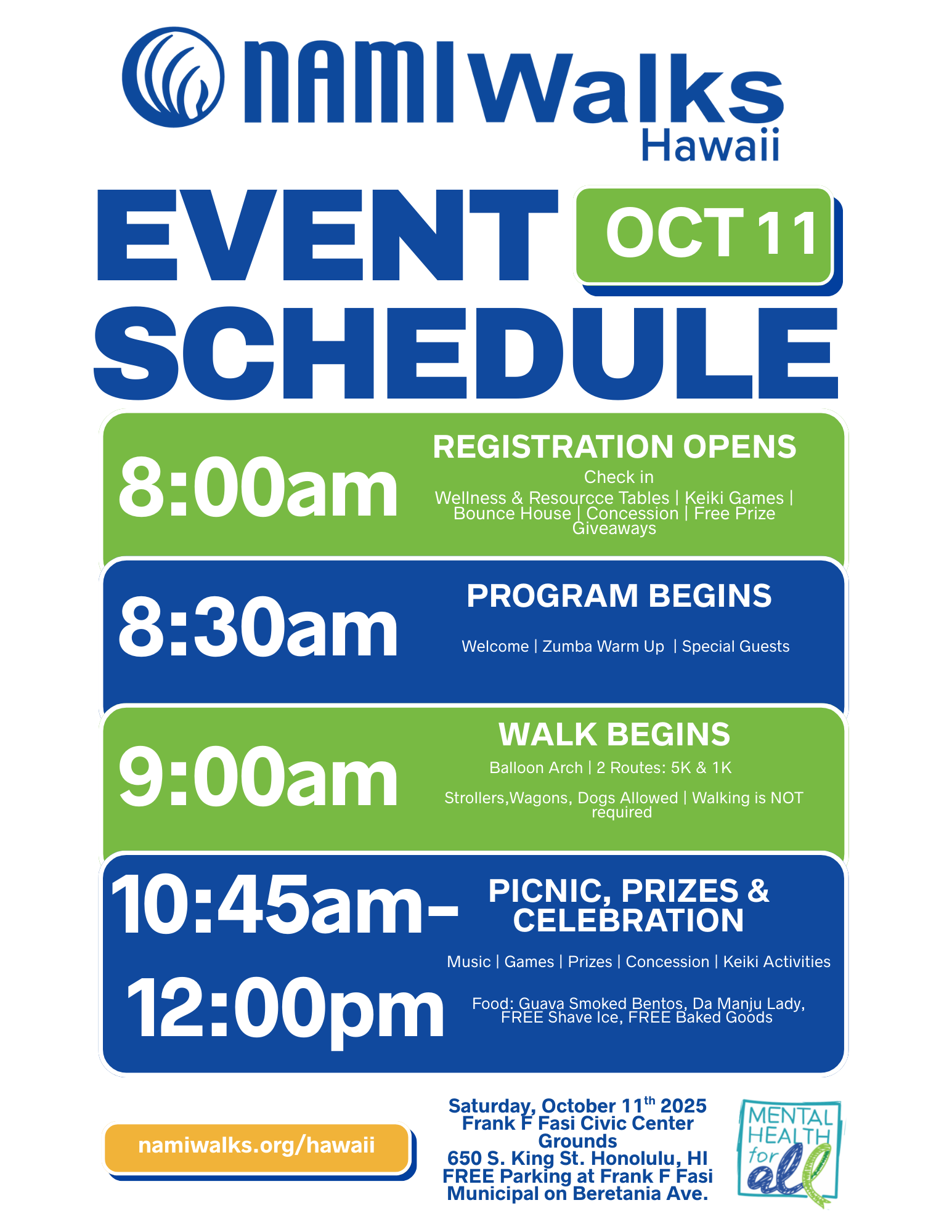 NAMIWalks 2025 will be at the Frank F Fasi Civic Grounds on Oct 11th, from 9am-1pm.