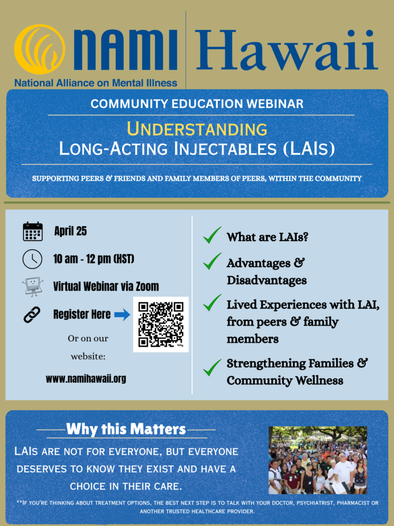 Join NAMI for a virtual webinar on Saturday, April 25, to learn more about LAIs, what the advantages/disadvantages are, and learn more from peers and family members who have directly been through this treatment. LAIs are not for everyone, but everyone deserves to know they exist and have a choice in their care.