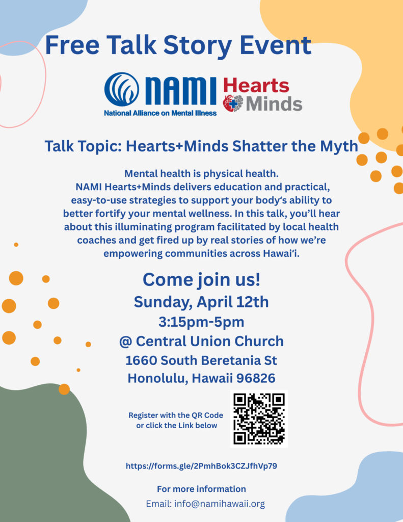 NAMI Hawaii is holding an in-person Talk Story event quarterly in 2026, with the first event’s focus being on one of our newer programs, NAMI Hearts and Minds: mental health is physical health. Come join us in-person on Sunday, April 12th to learn more and connect with the NAMI Board and NAMI community